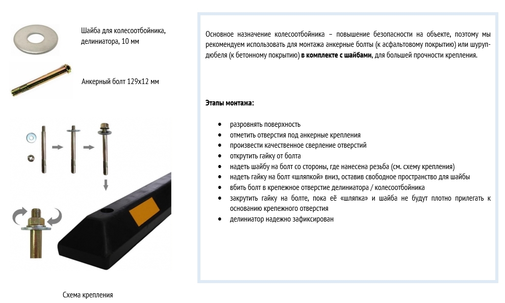 Основное назначение колесоотбойника – повышение безопасности на объекте, поэтому мы рекомендуем использовать для монтажа анкерные болты